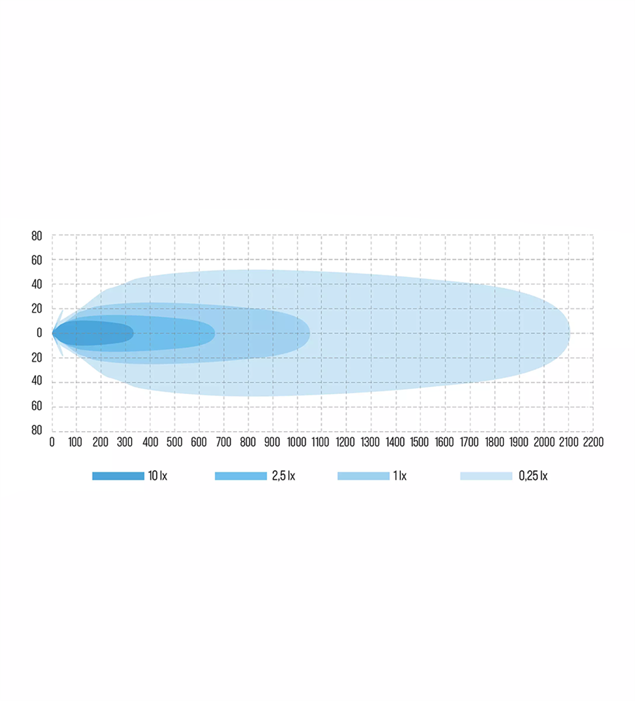 • 9-32V • Räckvidd: 1 lux @ 1055m • 12300 Lumen (teoretiska) • 160W OSRAM LED • Färgtemperatur: 5500K • Aluminiumhus • Lins i polykarbonat, mörk optik • Mått: Höjd:244mm (med. fäste), djup: 80mm, diameter:228mm • DT-kontakt med 500mm kabel • IP68