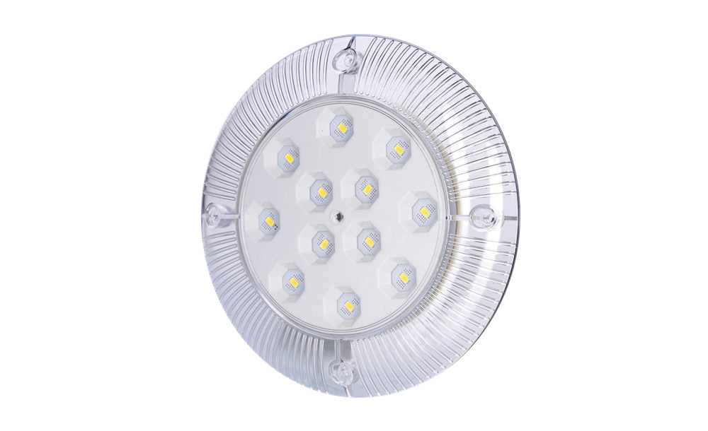12V innerbelysning, rund för utanpåliggande installation. Vit reflektor.