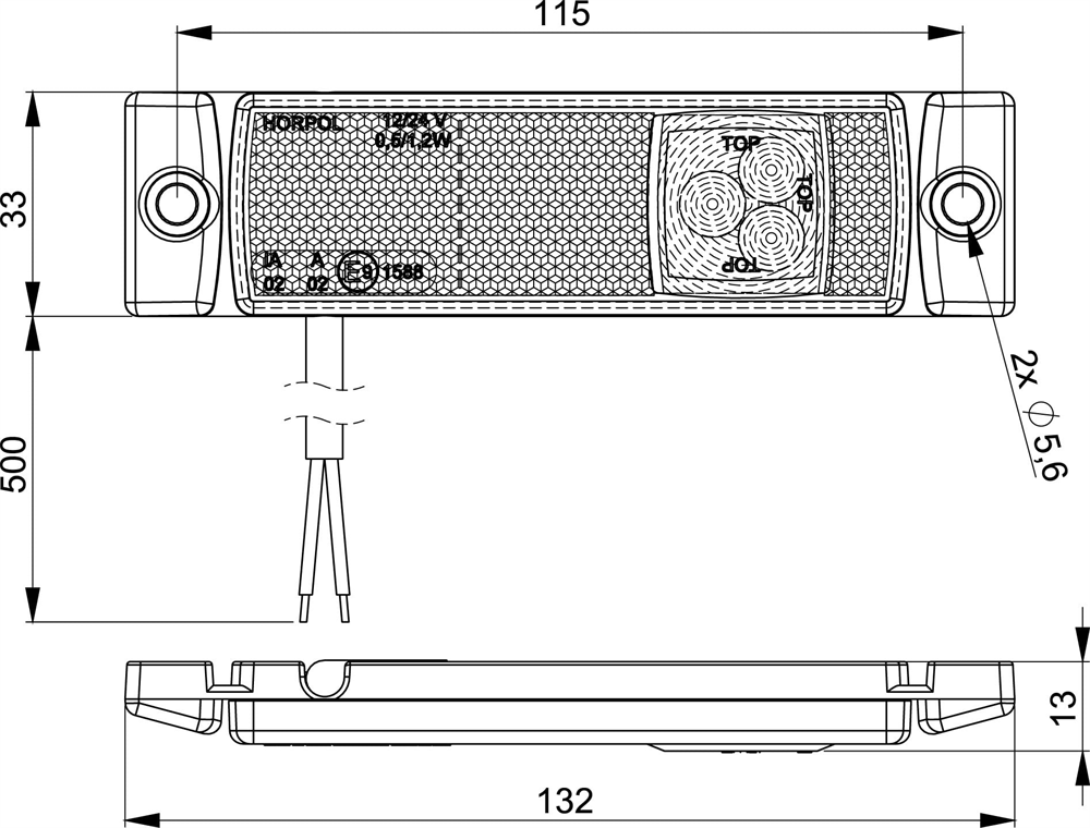 • 12/24V• 0,5W/1,2W• 3 led• Mått: 132x33x13mm• CC-mått skruvhål: 115mm• IP68• Kabellängd 0,45 m, 2x0,75 mm²• Arbetstemperatur: -30°C till +50°C• Tillverkare: Horpol